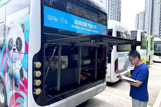为践行成都世运会绿色低碳办赛理念,这批氢能公交车通过“氢”和“氧”的电化学反应产生电能从而驱动车辆,全程只产生水,真正实现零排放。
